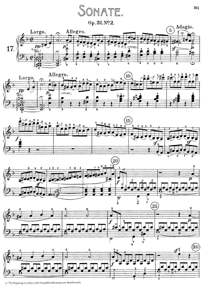 路德维希·凡·贝多芬于1801年至1802年间创作了他的第十七号钢琴奏鸣曲(作品31号第2号)。这部作品分为三个乐章,D小调,通常被称为“暴风雨”(Der Sturm)。然而,这个名字并非贝多芬本人所起,在他生前也从未有人用这个名字来称呼这首奏鸣曲。相反,它源于他的同事安东·辛德勒的说法,他声称这首奏鸣曲的灵感来自莎士比亚的同名戏剧。学者们对辛德勒的很多信息持怀疑态度。这首曲子的标准演奏大约需要25分钟。