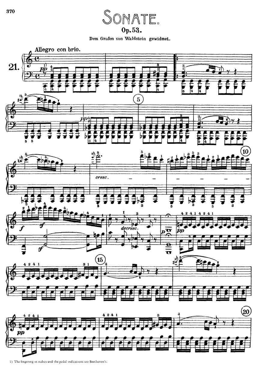 第21号钢琴奏鸣曲(作品53),昵称“华尔斯坦”,被认为是贝多芬最伟大的钢琴奏鸣曲之一。这首奏鸣曲完成于1804年,其规模超越了贝多芬之前的奏鸣曲,更是他技术上最具挑战性的作品之一。它是贝多芬“英雄时期”(1803-1812)早期的一部关键作品,为贝多芬后期以及所有后世作曲家宏伟的钢琴作品奠定了基础。“华尔斯坦”的名字源于贝多芬献给维也纳的费迪南德·恩斯特·加布里埃尔·冯·华尔斯坦伯爵的献词,后者是贝多芬的赞助人兼密友。这首奏鸣曲在意大利语中也被称为“L’Aurora”(黎明),因为开头和弦的响亮,据说让人联想到黎明的景象。