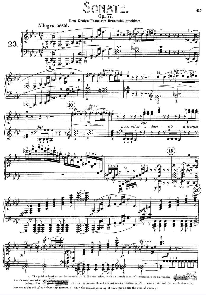 贝多芬的F小调第23号钢琴奏鸣曲(作品57),俗称“热情奏鸣曲”,被认为是他中期最伟大的钢琴奏鸣曲之一。这首奏鸣曲创作于1803-1806年间,出版于1807年,并献给弗朗茨·冯·布伦瑞克伯爵。“热情奏鸣曲”这个昵称是由这首四手联弹作品的出版商于1838年命名的。贝多芬认为“热情奏鸣曲”是他创作《锤子键琴》之前最优秀的钢琴奏鸣曲,并称赞其“对情感和音乐的精彩演绎”。热情奏鸣曲三个乐章的平均演奏时长约为23分钟。