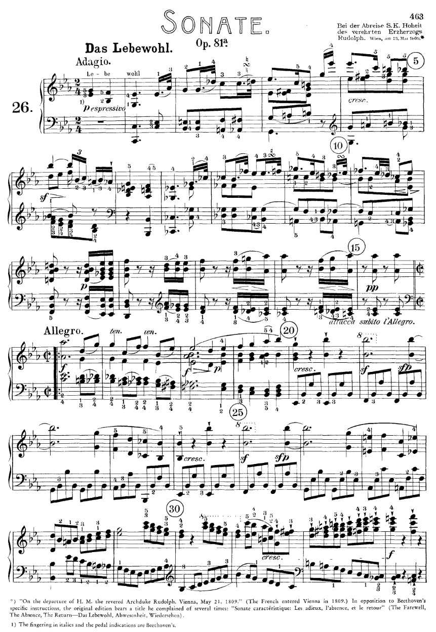 路德维希·范·贝多芬于1809年至1810年间创作了他的第26号钢琴奏鸣曲,作品81a,又名《告别》。贝多芬本人认为,这首名为《告别》的乐曲是对德语“Lebewohl”(意为“莱贝沃尔”)的拙劣翻译。这首乐曲本身是献给贝多芬最伟大的赞助人奥地利的鲁道夫的,被认为是贝多芬在技术难度和情感深度方面最具挑战性的作品之一。一场标准演奏时长约为17分钟。