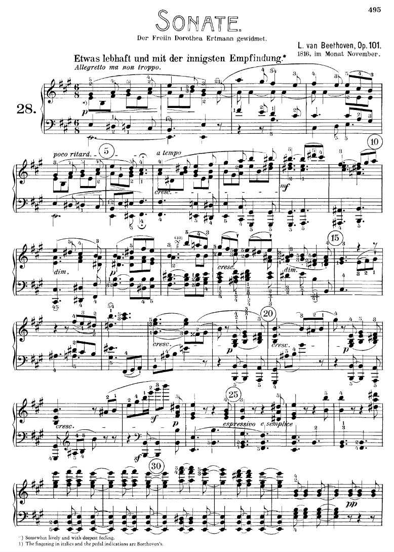 贝多芬第28号钢琴奏鸣曲(作品101)创作于1816年,献给钢琴家多罗特娅·埃特曼男爵夫人。作品约20分钟,由四个乐章组成。这部作品开启了贝多芬“晚期”系列奏鸣曲的创作,此时他的音乐走向了一个新的方向,走向了更个人化、更私密,有时甚至更内省的自由与幻想境界。在这一时期,他对形式、织体和调性已达到炉火纯青的境界,并颠覆了他所掌握的那些传统,创作出极具深度和美感的作品。将对位技巧融入奏鸣曲式也是这些晚期作品的一大特色。