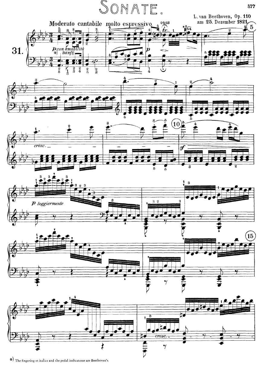 路德维希·凡·贝多芬的第 31 号钢琴奏鸣曲创作于 1821 年,是作品 109–111 的核心作品。这首奏鸣曲分为三个乐章。1819 年夏天,柏林出版公司的莫里茨·施莱辛格会见了贝多芬,并要求购买一些作品。经过一番谈判,施莱辛格同意以 60 达克特的价格购买 25 首歌曲,以 90 达克特的价格购买三首钢琴奏鸣曲。1820 年 5 月,贝多芬同意了,因为歌曲(作品 108)已经可以买到,他承诺在三个月内交付奏鸣曲。这三首奏鸣曲就是现在的作品 109–111。由于黄疸等因素,贝多芬未能按时完成承诺的全部三首奏鸣曲。
