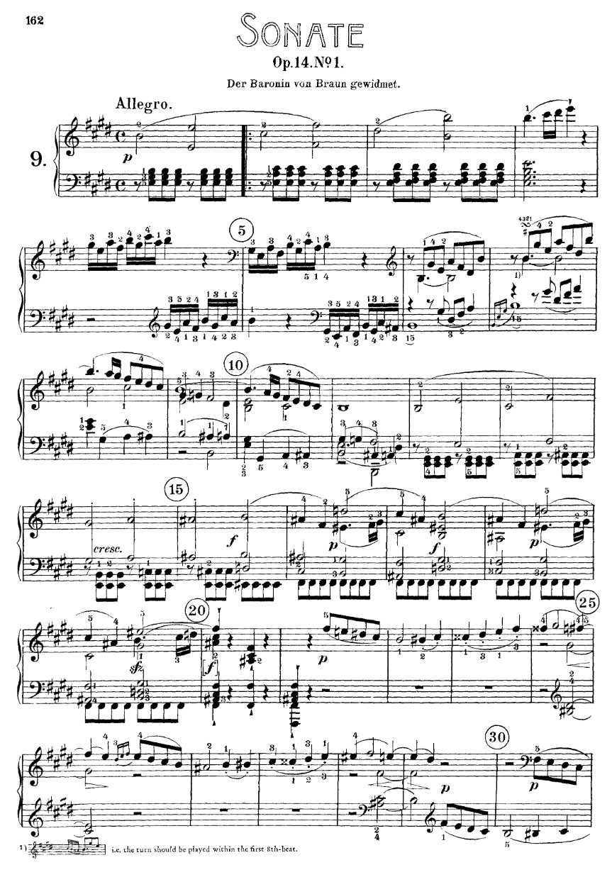 路德维希·凡·贝多芬于1798年创作了E大调第九钢琴奏鸣曲(作品14号,第一首),并将其献给约瑟法·冯·布劳恩男爵夫人(她也是作品14号系列中第二首奏鸣曲的受赠者)。这首作品看似简单,且属于贝多芬的早期作品,但它引入了许多新颖的作曲技巧,为作品增添了“狂飙突进”的风格,后来发展成为贝多芬的标志性风格。这首奏鸣曲于1801年被改编为弦乐四重奏,并因此被移调至更舒适的F大调。