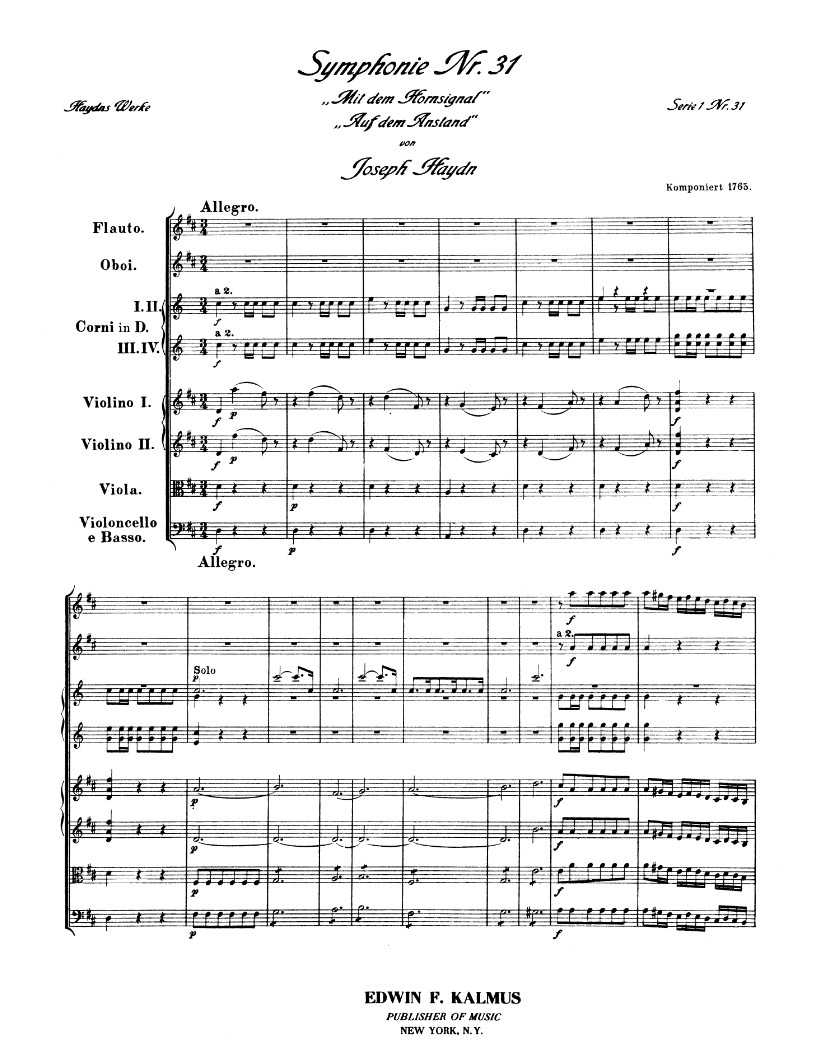 海顿的D大调第三十一交响曲创作于1765年,献给他的赞助人尼古拉斯·埃斯特哈齐。这部作品被戏称为“号角信号交响曲”,因为它赋予了当时规模异常庞大的圆号声部(即四位演奏者)以突出的角色。由于其突出的助奏乐段,西贝尔将这部作品以“协奏交响曲”的形式出版。《号角信号》的创作是为了庆祝埃斯特哈齐圆号声部恢复四位演奏者的完整阵容。这部作品由一支长笛、两支双簧管、四支圆号和弦乐谱组成。考虑到海顿使用的弦乐演奏者数量,这种不平衡的音调令人印象深刻。这部作品分为四个乐章。