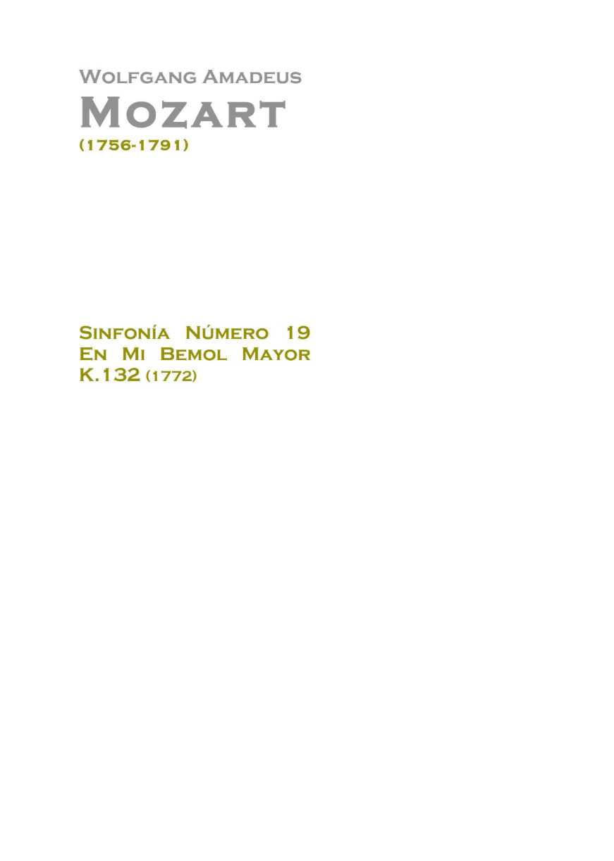 Eb大调第十九交响曲(K.132)由沃尔夫冈·阿马德乌斯·莫扎特创作于1772年7月。这部交响曲由两支双簧管、四支圆号(其中两支以独特的“降E中音”调式演奏)和弦乐组成。第一乐章以莫扎特后来在其同调第二十二钢琴协奏曲开头使用的动机开场。呈示部简短,无重复。发展部侧重于新素材。此外,还有一个慢乐章,标记为“Andantino grazioso”(小行板)。第一、二、四乐章的速度标记均由利奥波德·莫扎特亲笔书写。终曲采用七部法式回旋曲(ABACADA)结构。除最后的A部分外,回旋曲的每个部分都重复出现。
