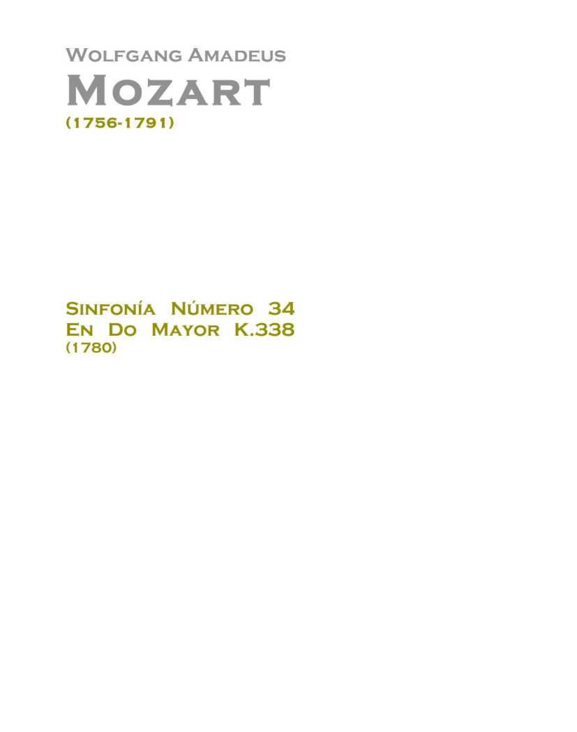 C大调第34交响曲(K.338)由沃尔夫冈·阿马德乌斯·莫扎特创作于1780年。该交响曲分为三个乐章,这在古典主义早期仍然很常见。这部交响曲以典型的“节日交响曲”或“小号交响曲”的号角和华彩乐段为特色,这是奥地利C大调交响曲创作的典型特征。这是莫扎特C大调交响曲中第一部展现这种特征的作品,但这种风格在他随后创作的两部C大调作品——第36交响曲和第41交响曲中得到了重新演绎。第一乐章采用奏鸣曲式,但也包含许多意大利序曲的风格和形式特征。乐章中没有呈示部重复。呈示部尾声包含一个类似序曲的渐强,但并未包含在再现部中。乐章的发展完全基于新素材。呈示部第一主题的再现部分被缩短,并被该主题的简短展开打断。乐章的尾声几乎包含了整个第一主题,营造出意大利序曲中常见的反向再现效果。这部作品由两支双簧管、两支巴松管、两支圆号、两支小号、定音鼓和弦乐组成。